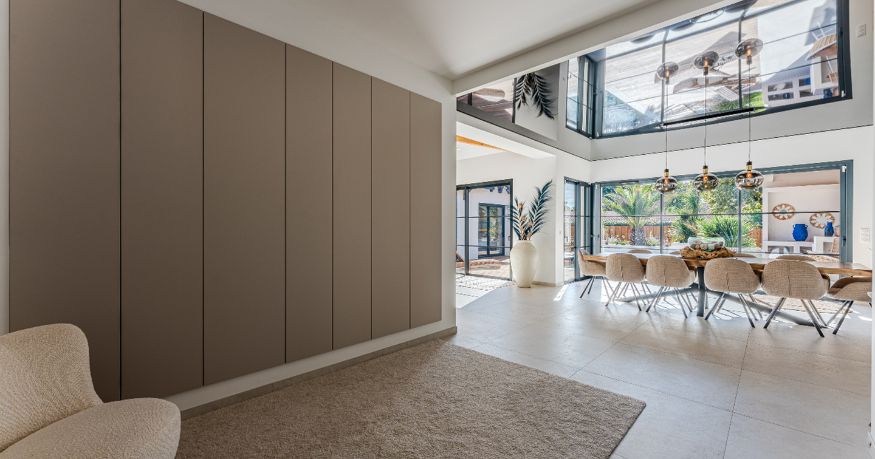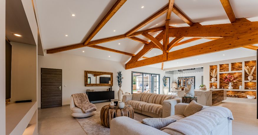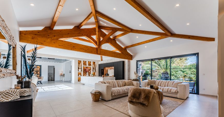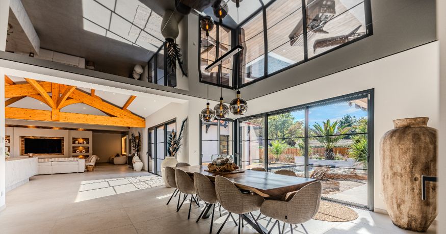 D’un point de vue volumétrique, l’habitation adopte des formes simples et une échelle respectueuse de son environnement. Construite de plain-pied, elle optimise l’emprise au sol sans générer de volumes dominants, assurant ainsi une insertion harmonieuse dans le paysage local.